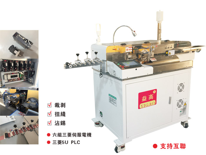 一、特點說明(product presentation) 1、主要元件均采用進口品牌:德國FESTO電磁閥、日本SMC電磁閥、日本SMC氣缸、日本三菱 電機伺服器、日本THK絲桿導軌、日本SMC數顯氣壓檢測表、日本歐姆龍OMRON溫控表、臺灣威倫WEINVIEW顯示屏等。 2、采用日本三菱控制系統,日本三菱 PLC控制器配合全伺服馬達控制,使送線、裁線、剝皮、扭線、沾錫等位置更為精準穩定,采用全進口元件,使設備品質更有保障、運行更為持久、順暢、穩定。 3、全電腦控制:包括裁線長度、剝口長度、半剝長度、扭線長度、扭線松緊、沾錫長度、電腦調刀(無需墊片)、助焊劑下滴頻率,下滴時間,電腦數字化操作,顯示屏上輸入即可。 4、采用電腦式自動檢測,氣壓低下,電機故障,皮帶異常等狀況時能自動停機,并將檢測顯示出故障原因,方便迅速排除故障,缺線、無助焊劑時電腦自動提示。 5、廢料采用真空吸料方式,解決了錫水助焊劑四處飛濺的苦惱,乾凈、方便、簡單。 6、機臺運行中低噪音、低耗電、高速度、高效率且電腦帶有記憶儲存功能。