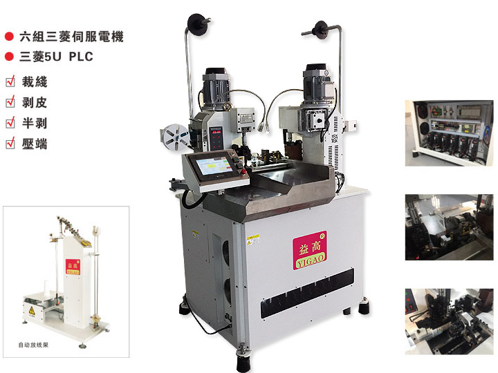 1、伺服式高速全自動雙頭端子壓著機使用日本松下伺服電機、日本三菱PLC及人機介面觸摸屏,采用日本SMC氣缸、電磁閥,德國FESTO電磁閥、調氣閥,日本和泉IDEC開關、日本神視SUNX光纖、光纖放大器,日本歐姆龍OMRON編碼器、感應器,日本住友SUMITOMO減速機等等。全伺服電腦控制,七寸觸摸屏寬大、直觀且能自由旋轉180度,易看易學易懂易操作。 2、本機臺是一種精密型的兩端裁線剝皮壓著端子的高端設備,采用六臺日本松下伺服電機、原裝進口的滾珠絲桿驅動,使電線的輸送、電線兩端的剝皮及兩端的端子壓著位置非常精準,相互之間的動作銜接流暢。 3、內部數據的調整全在電腦上操作(調整裁線長度、剝皮長度、切線深度、壓端位置等等)。 4、自動檢測功能能及時有效地控制不良品的發生,且能及時發現并處理。YG-G3是一款安全、高效、精密的理想設備。 5、特殊線材需要加熱剝皮時,可以特別定制加熱式裁線剝皮全自動端子機,例如鐵氟龍電線、纖維電線等的加工!